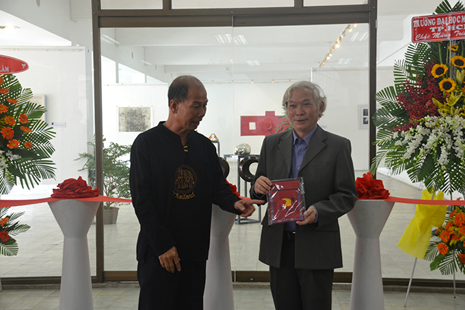 NGƯT.TS. Trương Phi Đức – Hiệu trưởng Nhà trường và Tiến sĩ KANAID SILAT - Đại diện Trường Đại học Khon Kaen, Thái Lan (người bên trái) tiến hành nghi thức cắt băng khai mạc triển lãm